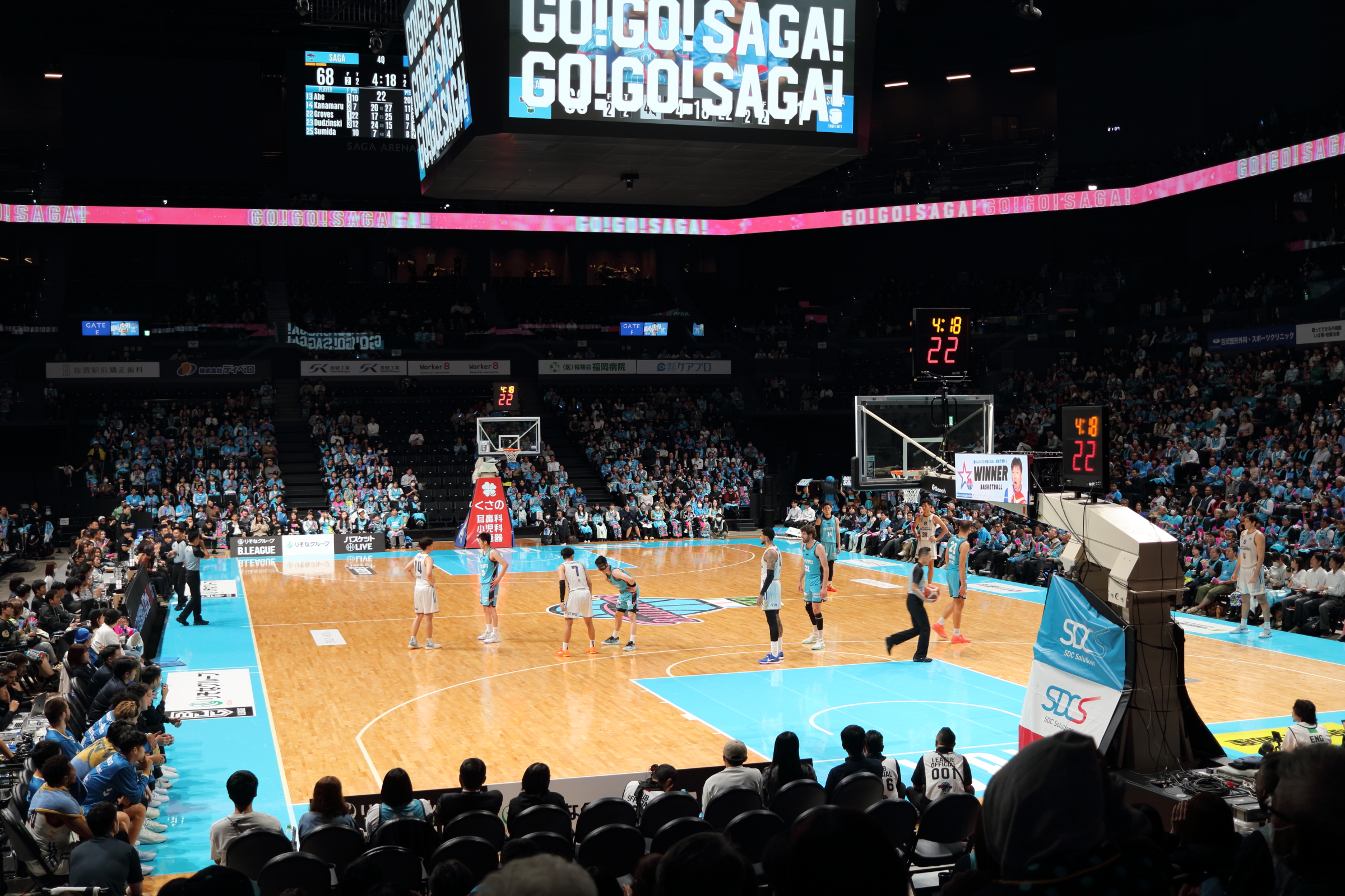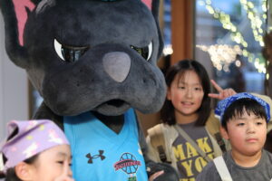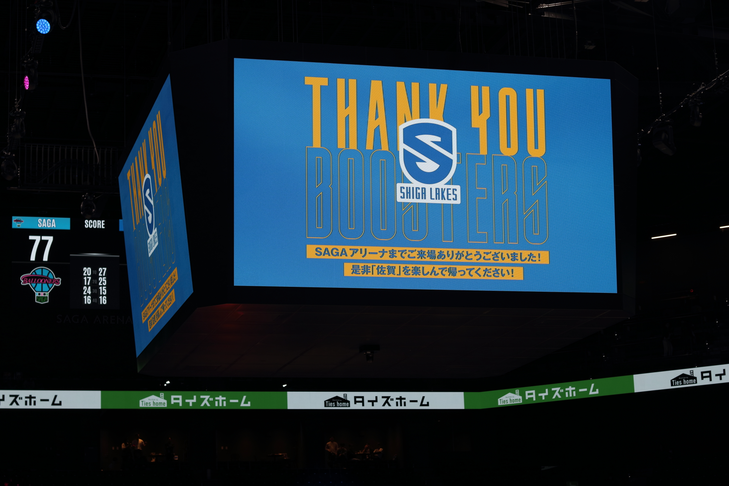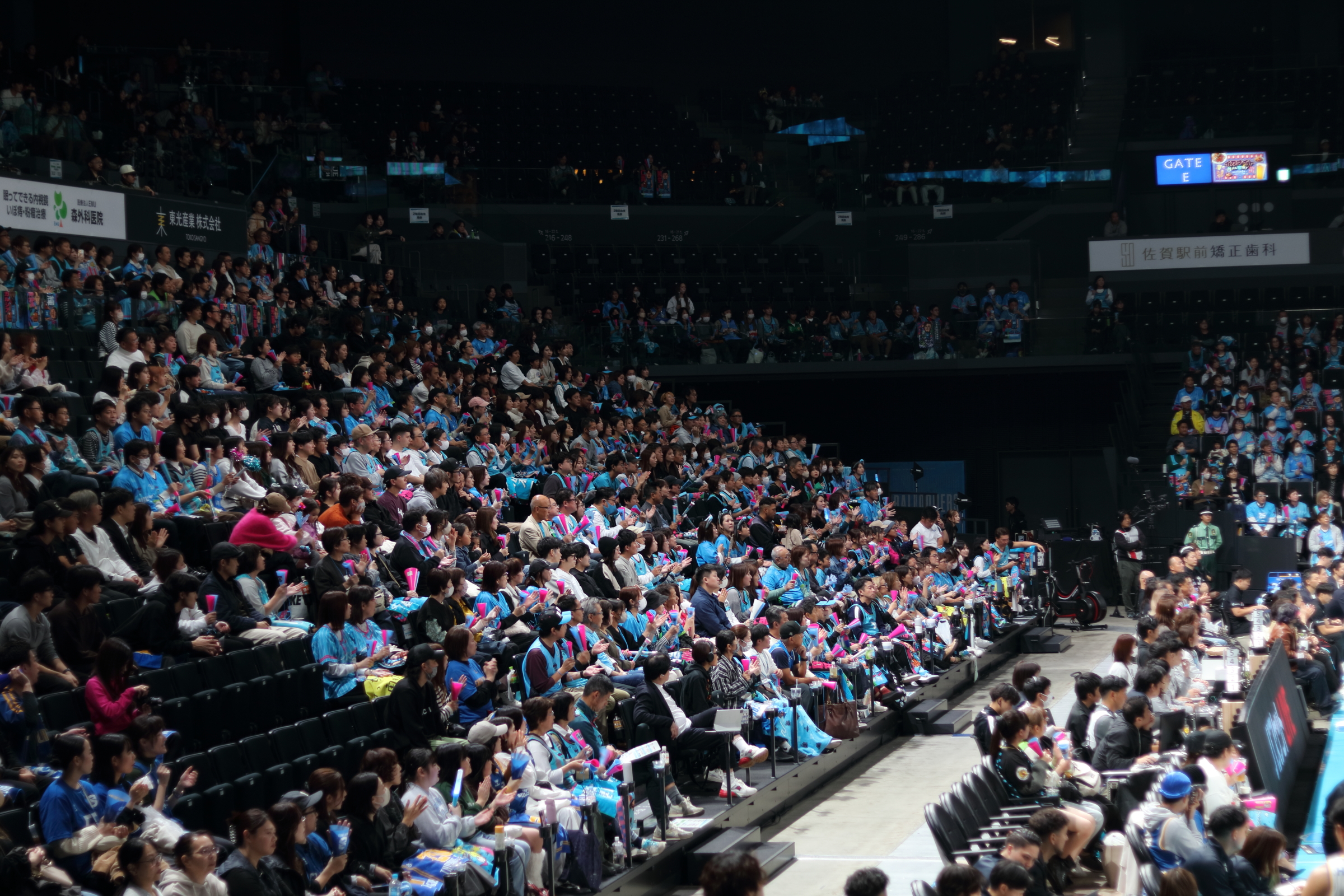 お腹も心も満たされた一行は、SAGAアリーナへ移動し、バルーナーズの応援席へ。試合は序盤からリードを許す苦しい展開となりましたが、子どもたちは最後まで諦めることなく、会場のブースターと一体となって「Go!Go!SAGA!」と大きな声援を送り続けました。