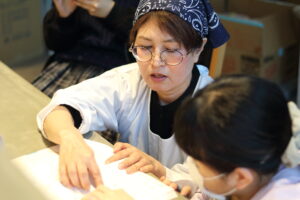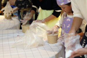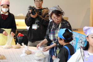 「粘土みたい!」「気持ちいい!」と夢中になる子どもたち。ある程度潰れたら、米麹と塩を加えて混ぜ合わせる作業へ。「おいしくなーれ、おいしくなーれ」と魔法の呪文を唱えながら、愛情を込めて揉み込む姿が印象的でした。