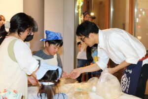 ワークショップの後は、こども食堂の一環として温かい食事が提供され、参加者全員で「いただきます!」と声を合わせ、味噌作りで仲良くなった友達やスタッフと共に楽しい夕食の時間を過ごしました。