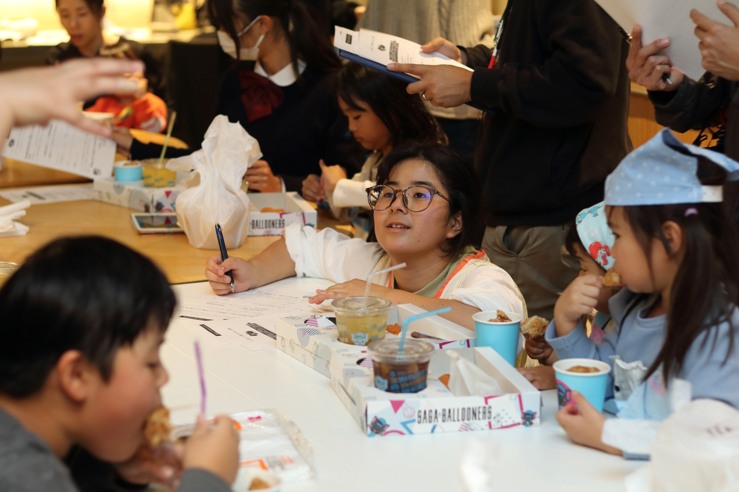 さらに、食事の後には佐賀バルーナーズからのサプライズプレゼントが!参加した子どもたち全員に、この日SAGAアリーナで行われる滋賀レイクス戦の観戦チケットが配られました。