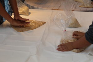 今回は、佐賀県産大豆フクユタカ、米麹、そして長崎県五島列島の塩というこだわりの材料を使用。ふっくらと茹で上がった温かい大豆の感触に歓声を上げながら、子どもたちは袋の上から一生懸命に大豆を潰していきます。