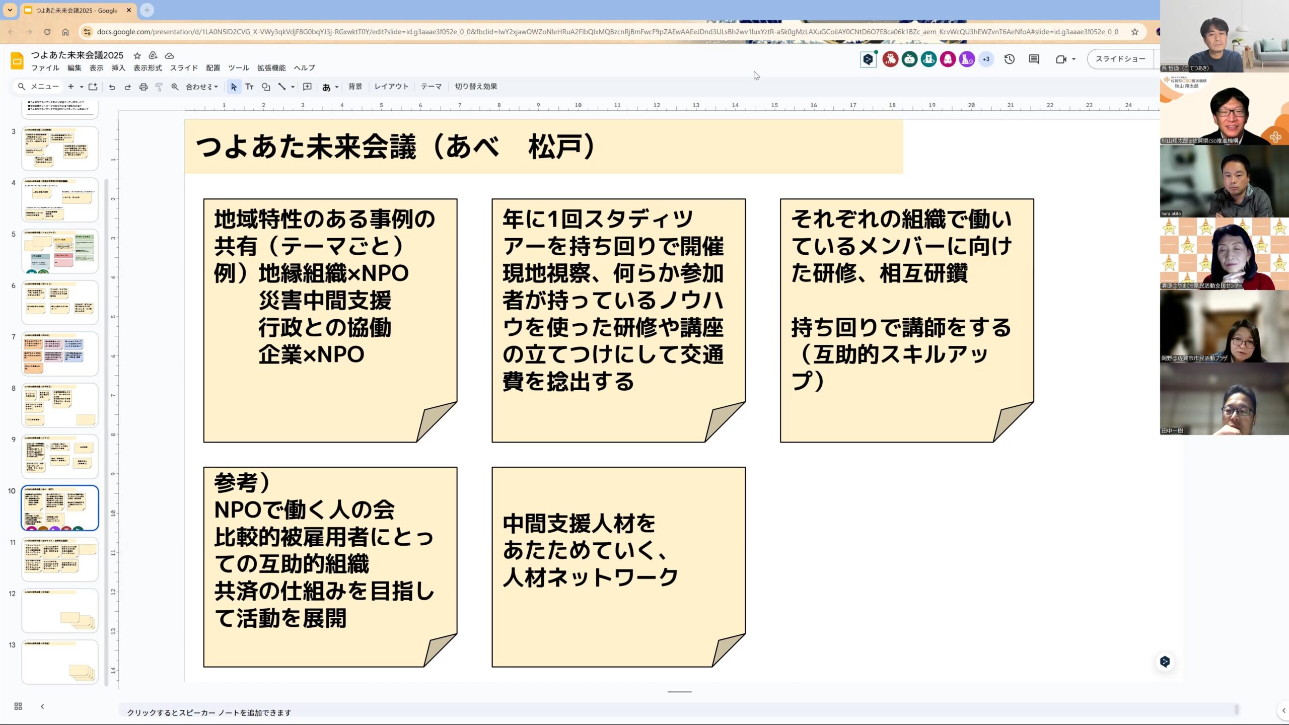 千葉県松戸市のべっち氏(=阿部 剛 氏)からは、「NPOで働く人の会」の共済的な仕組みを参考に、各組織のスタッフが得意分野を持ち寄って講師を務める「相互研修(持ち回り講師)」が提案されるなど、最新技術と互助的な学び合いを掛け合わせる方向性が示されました。