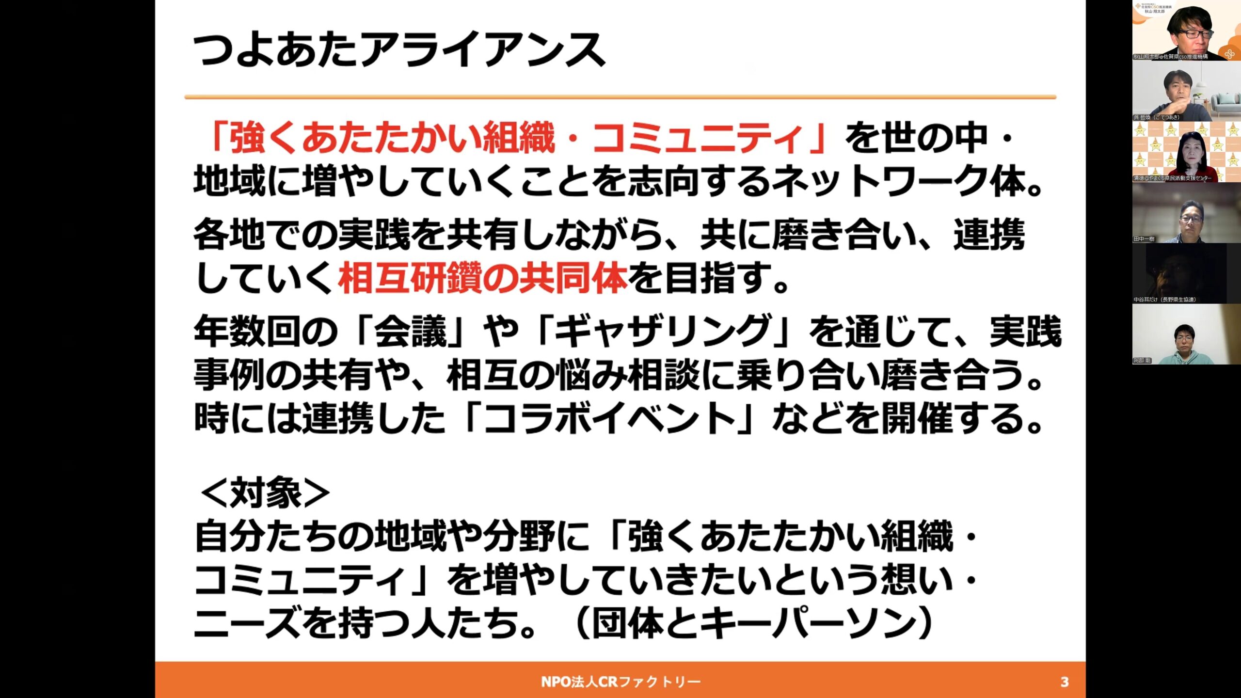 2025年11月28日(金)、「強くあたたかい組織・コミュニティづくりの全国アライアンス(通称:つよあたアライアンス)」による「つよあた未来会議~これからの中間支援ネットワークの未来を考える~」がオンラインZoomで開催されました。