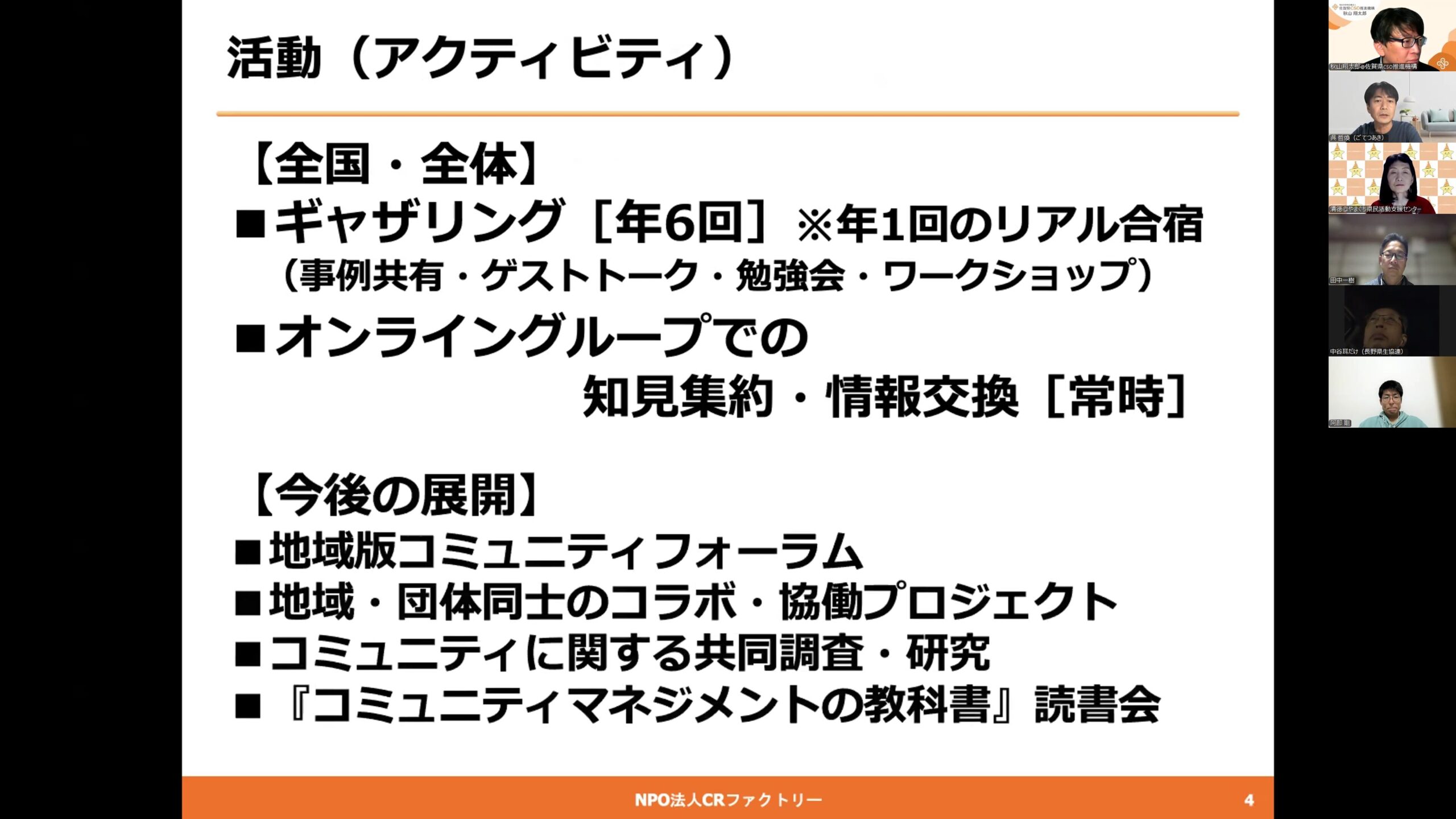 「ギャザリングイベント」を概ね奇数月に開催しており、全国各地の事例や知見を学び、悩みや課題を共有し、仲間ができることが期待されます。