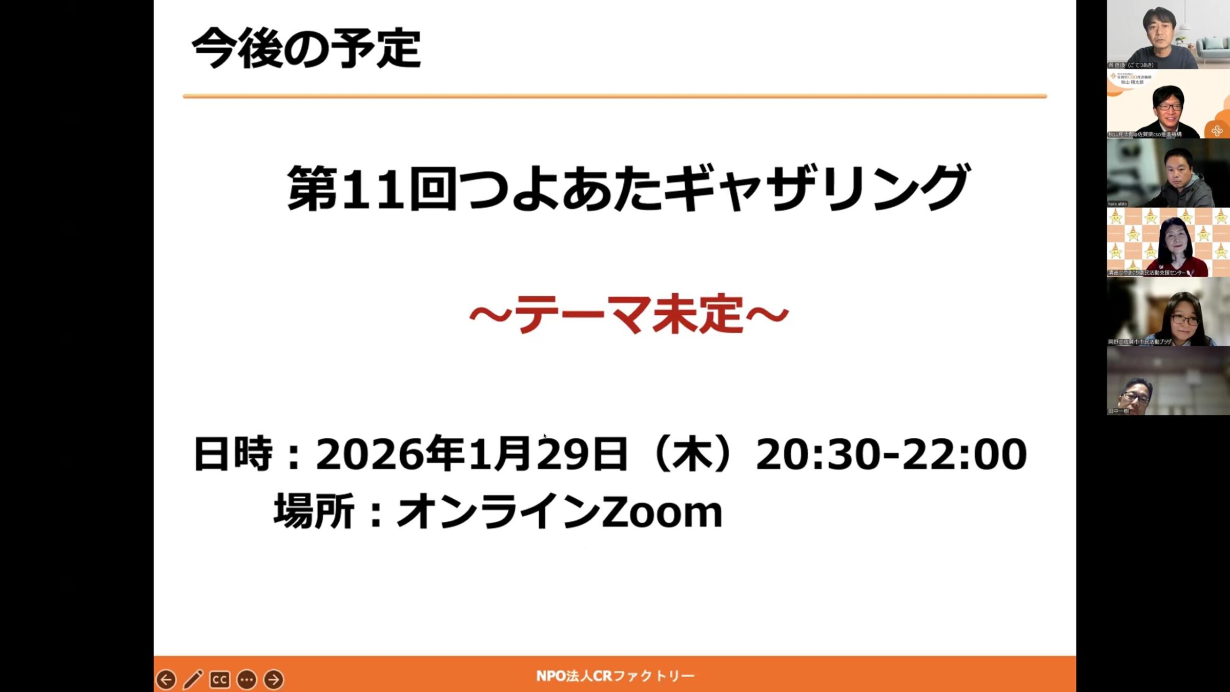 第11回つよあたギャザリングは、2026年1月29日(金)に開催されます。実施のテーマやゲストは、今回の「つよあた未来会議」で出されたアイデアをもとに検討されますので、楽しみにお待ちください。