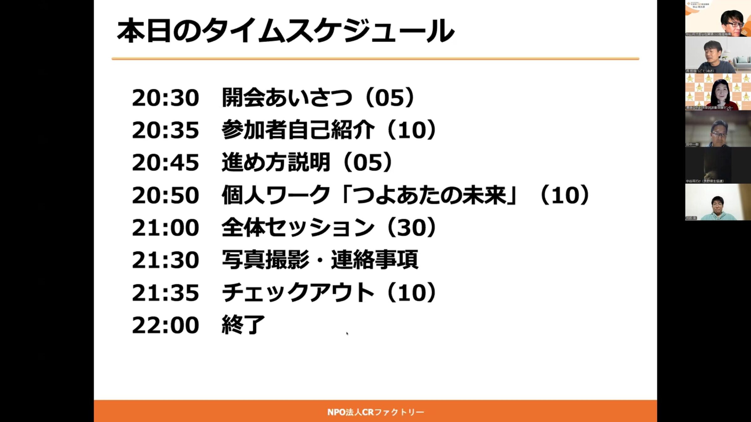 当日は夜の時間帯ということもあり、リラックスした雰囲気で進行しました。チェックインでは、入浴後や部屋着で参加するメンバーもいるなど、このアライアンス特有の「心理的安全性」の高さが垣間見えるスタートとなりました。