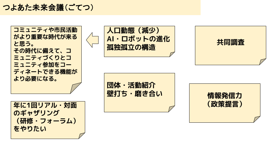 参加する地域・団体・メンバーが増え、ネットワークとしての厚みが増してきた今だからこそ、改めて「これからのつよあたアライアンス」および「これからの中間支援ネットワーク」のあり方について、参加者全員で車座になって議論するために今回の「未来会議」が企画されました。