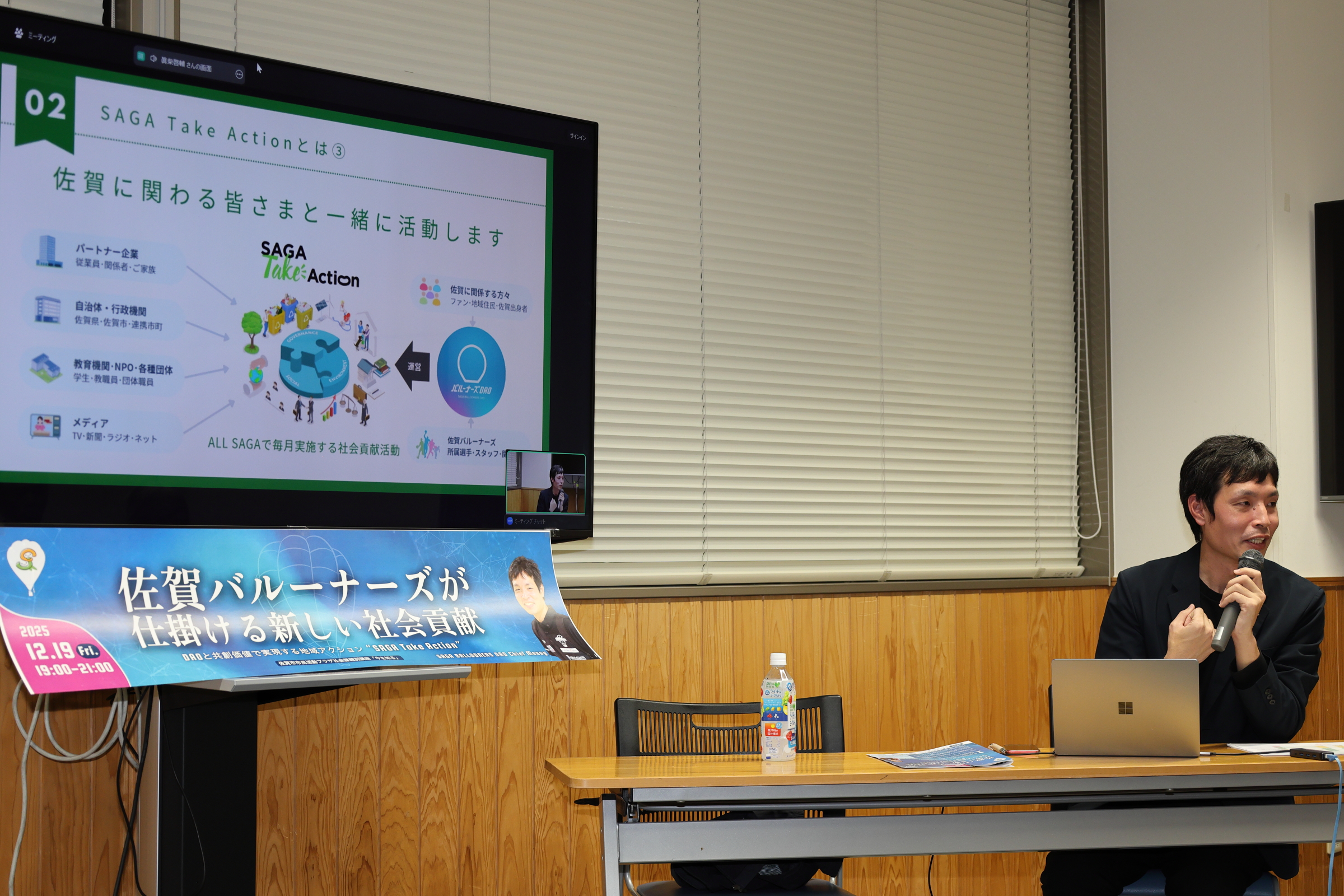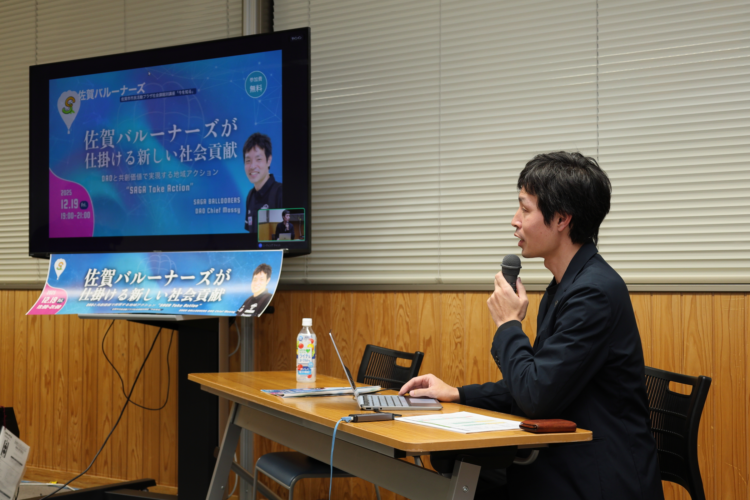 2025年12月19日(金)、佐賀市市民活動プラザ事業部では、社会課題別講座「今を知る」として、「佐賀バルーナーズが仕掛ける新しい社会貢献~DAOと共創価値で実現する地域アクション“SAGA Take Action”~」を開催しました。