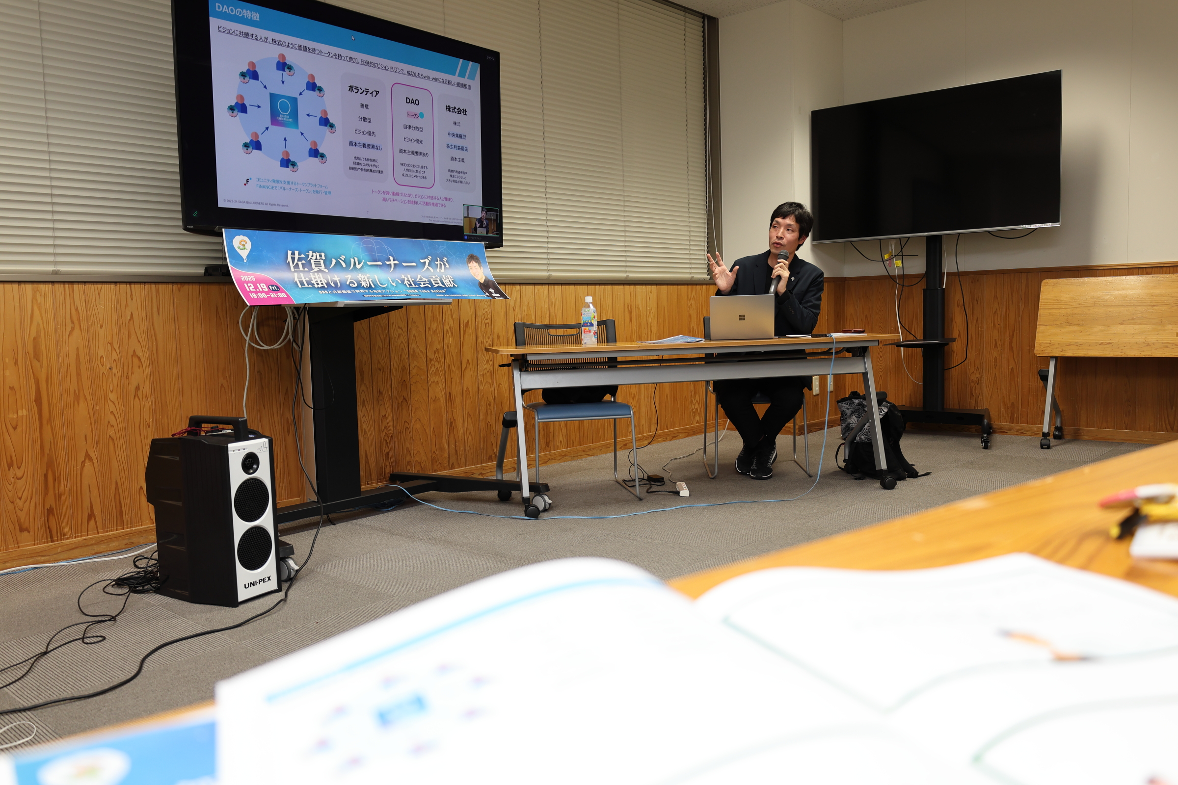 講師には、株式会社佐賀バルーナーズでSAGA Take Action、バルーナーズDAOを担当する眞柴 啓輔さん(ましば けいすけ)をお招きし、会場とオンラインのハイブリッド形式で25名の方にご参加いただきました。