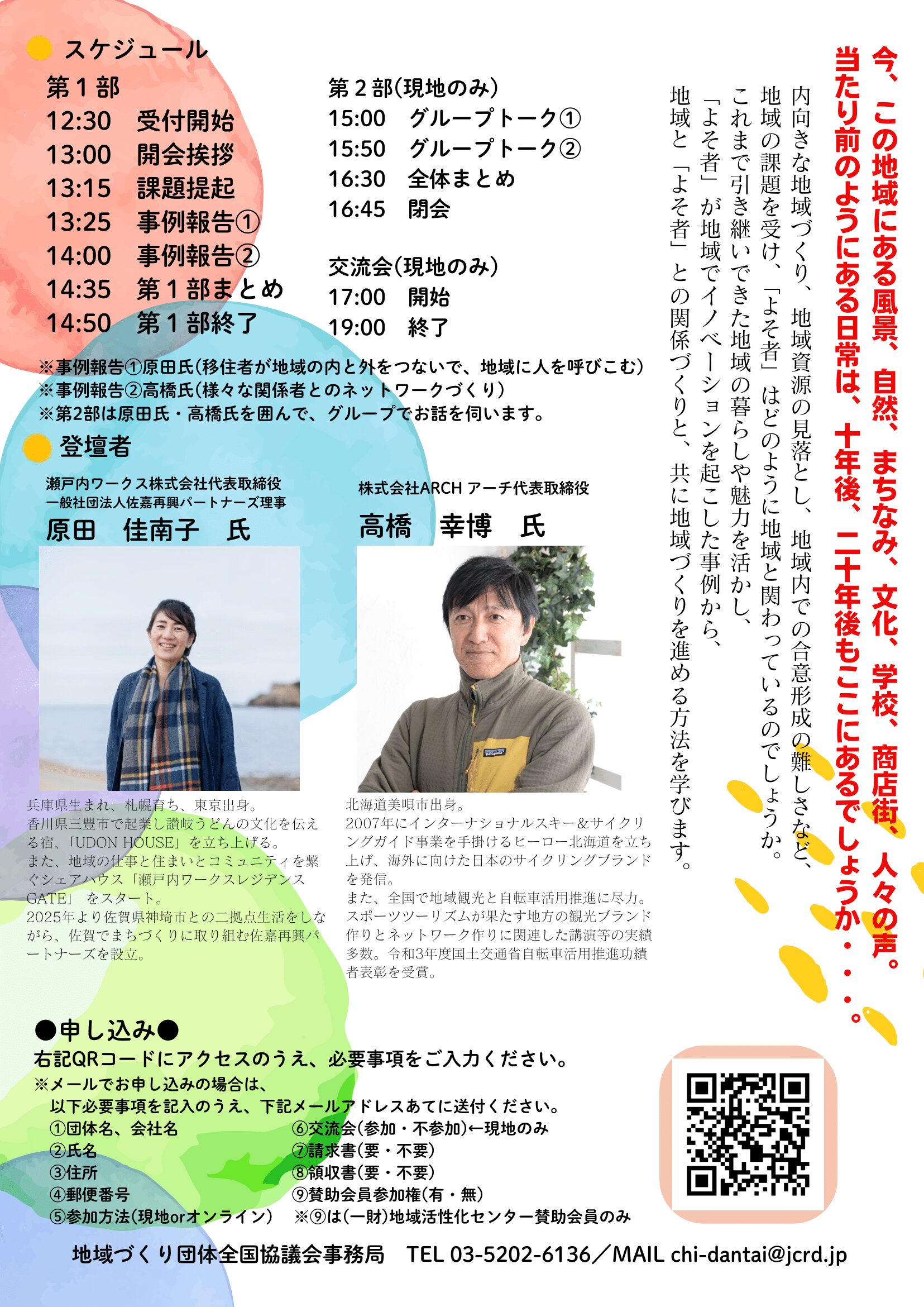 地域活性化の鍵となる「よそ者」の視点や、地域との関わり方について学び、実践的なノウハウを共有するまたとない機会です。当日は、先進的な取り組みを行うゲストによる事例報告や、参加者同士のグループトーク(現地のみ)が行われます。