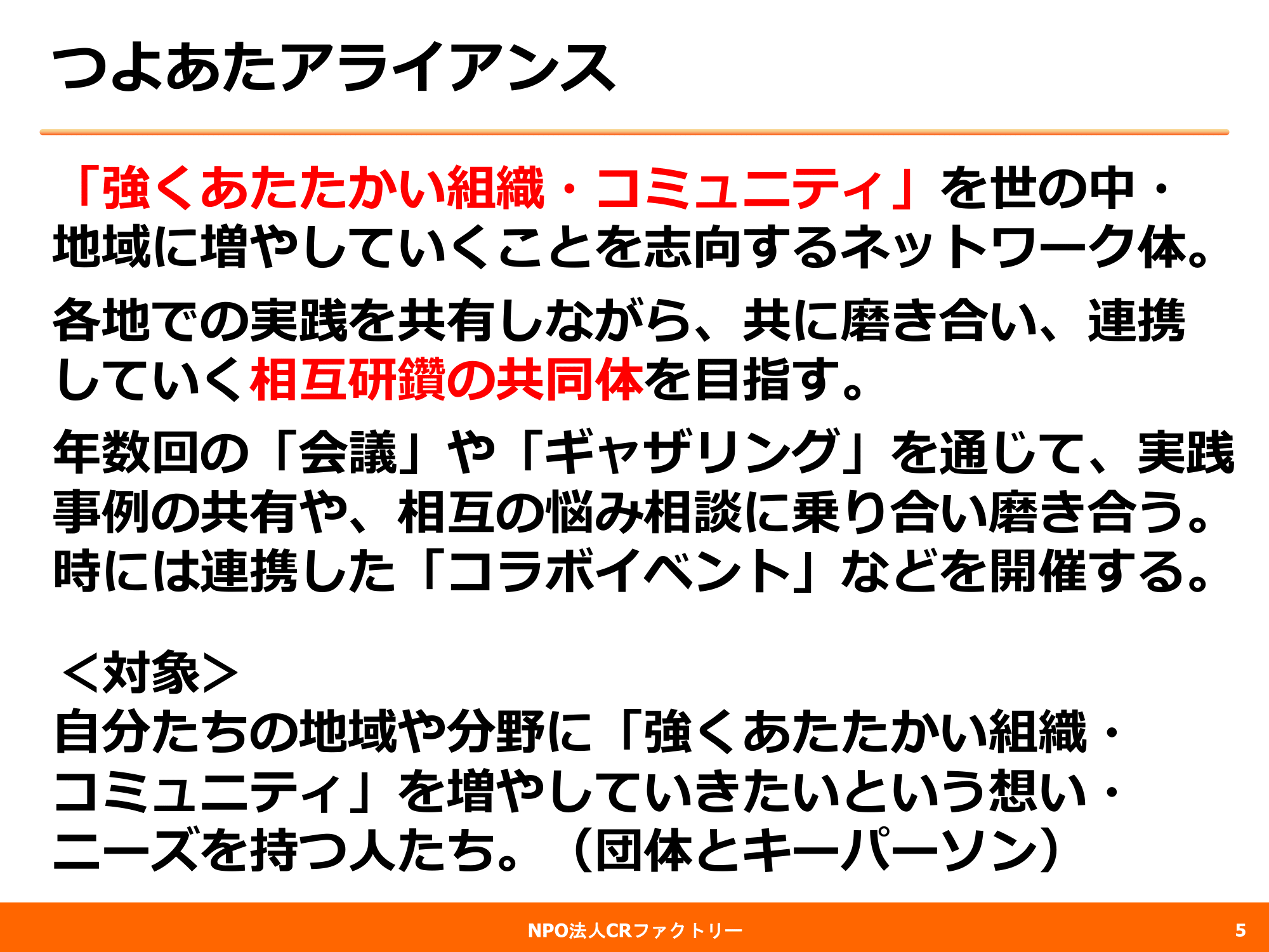 本アライアンスは、社会課題の解決を目指す組織・コミュニティが、単に活動の「強さ」を追求するだけでなく、内部の「あたたかさ」を両立させることを最も重要な目標としています。