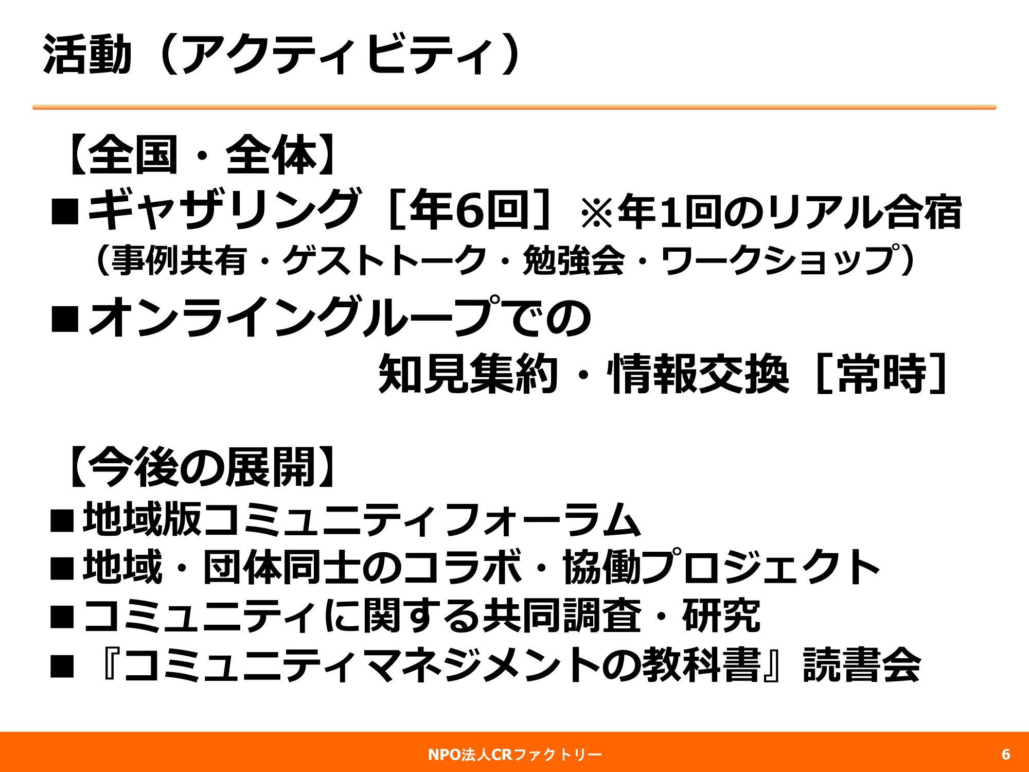 私たちは、『強くあたたかい市民活動・コミュニティ』を社会全体に増やしていくことを志向し、全国各地の多様な実践を通じて知恵と経験を共有し合う相互研鑽の共同体を目指しています。
